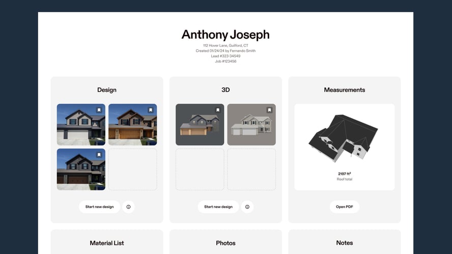 It all starts on the Project Details Page (PDP). Every job gets its own page, making it easier to find all the project information you need. Simply click on the card for the job details you need—whether it’s measurements, 2D or 3D design, estimates, proposals, photos, and more. We’ve also added simple job status indicators so you can see where a project stands.
